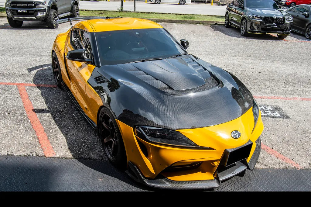 The VRS Style Carbon Fiber Hood for the Toyota Supra MK5 embodies the bold and aggressive spirit of Liberty Walk design while delivering functional performance benefits. Crafted from premium lightweight carbon fiber, this hood enhances cooling efficiency and reduces front-end weight — improving both aesthetics and performance for street and track enthusiasts alike.